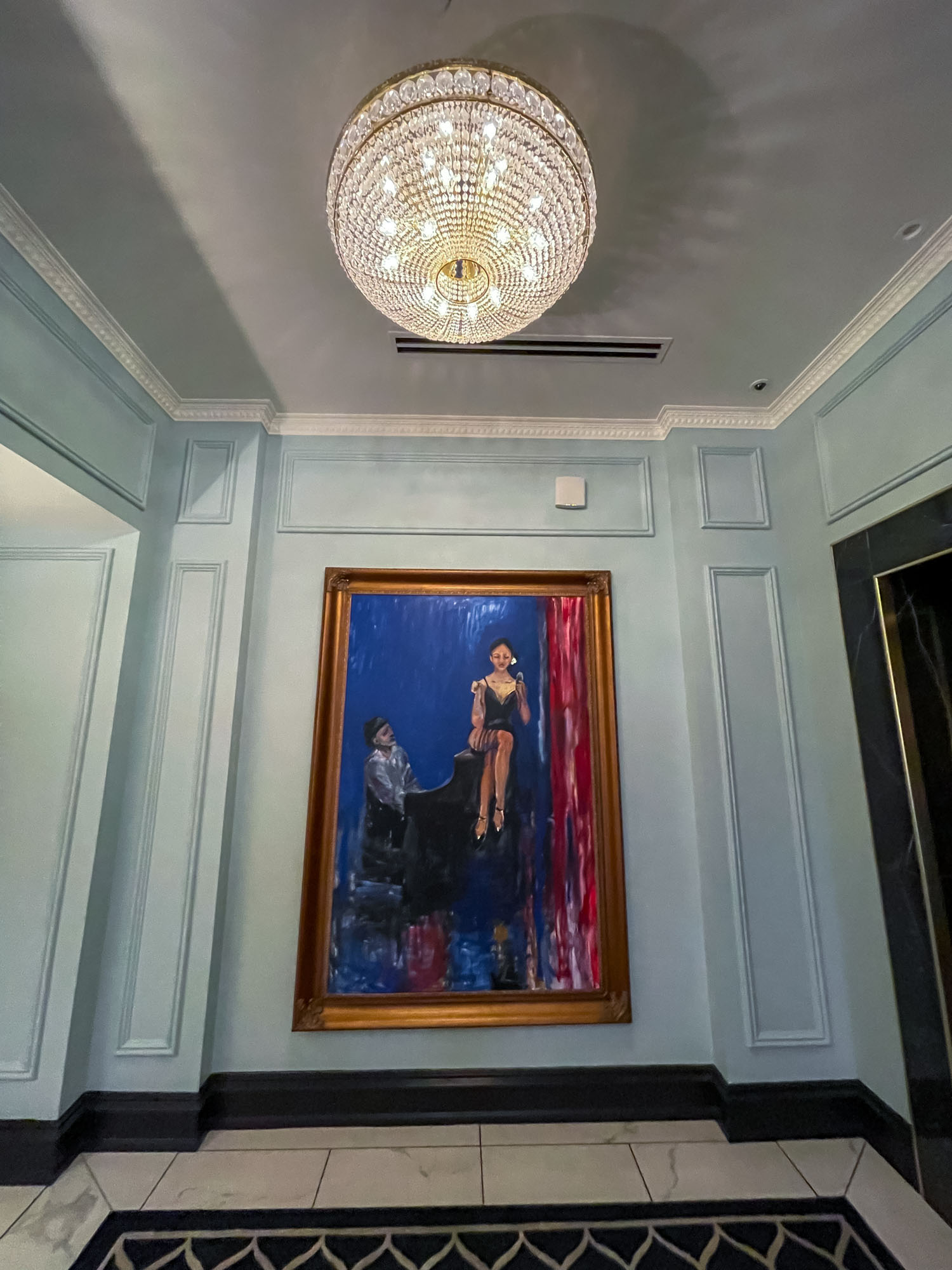 Grand entrance and gorgeous lobby with Art Deco-inspired luxurious decor (rich velvet, dark wood, gleaming brass).