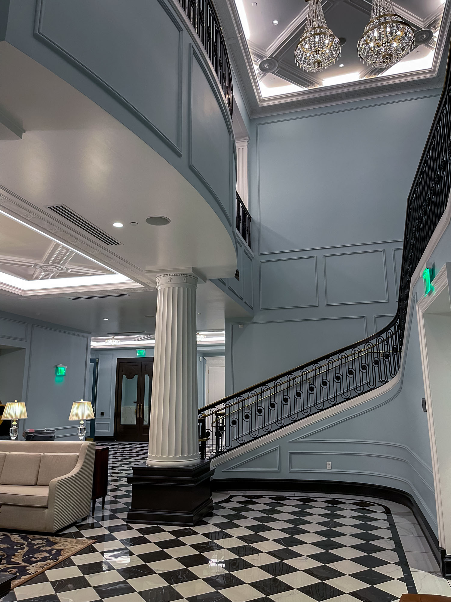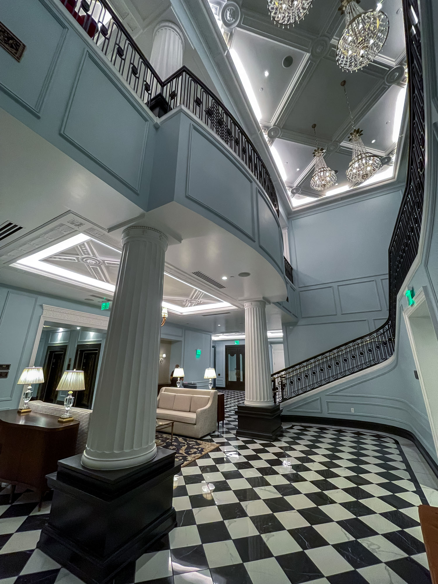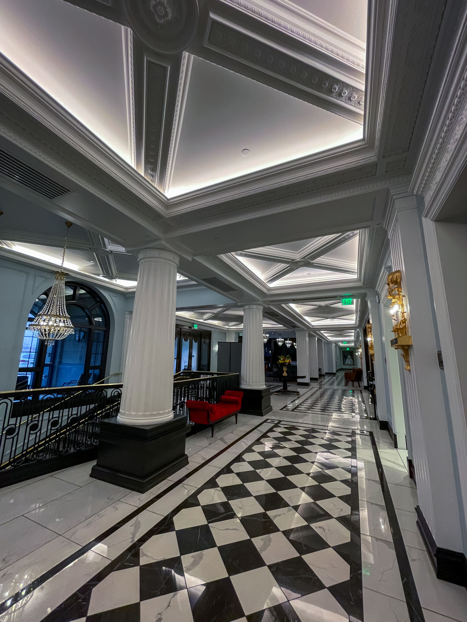 The Hotel Carmichael features a truly grand entrance and a gorgeous lobby that immediately impresses guests. Check-in was simple, aided by my Ambassador Elite status. The luxurious decor—rich velvet, dark wood, and gleaming brass accents—speaks to a deep Art Deco-inspired elegance. The central master staircase in the lobby is a signature architectural piece, symbolizing the hotel’s commitment to classic, sophisticated design and an uncompromising sense of tranquility and style.
