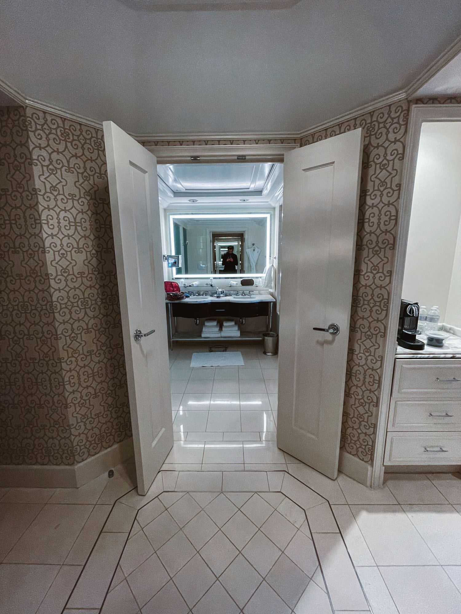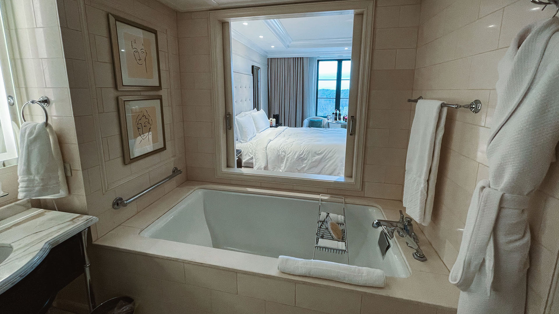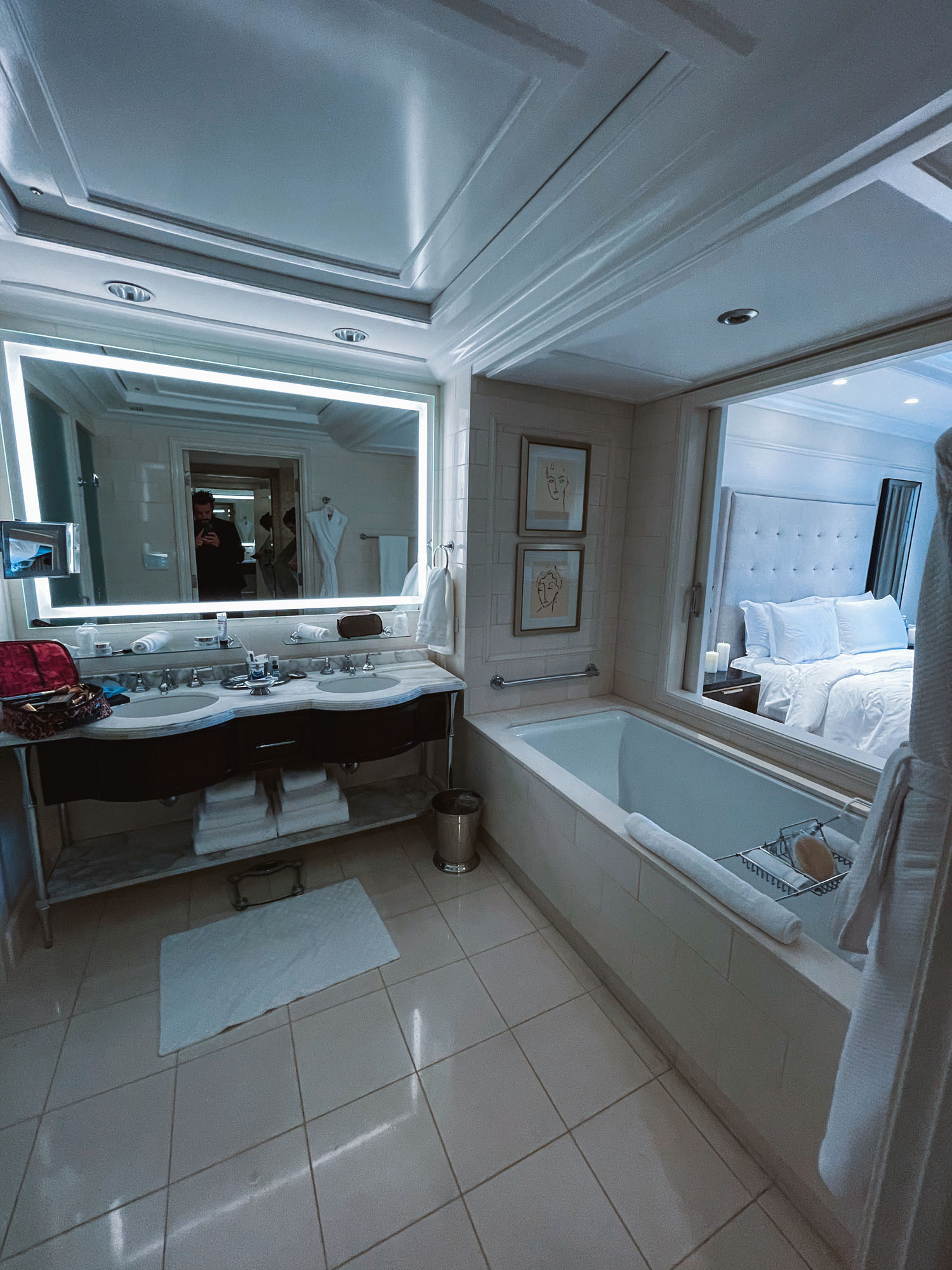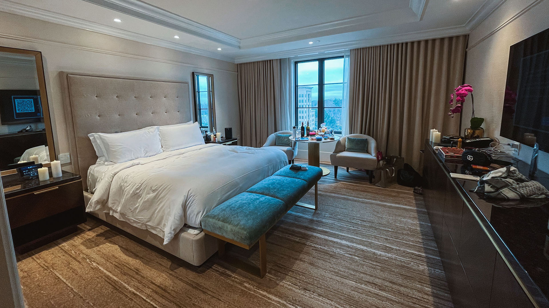 Our room was more than just a place to sleep; it was a serene sanctuary of comfort and impeccable style. The generous expanse of the space, thoughtfully designed with a calming palette of soft cream, warm taupe, and subtle mineral green hues, offered a harmonious blend of traditional charm and contemporary sophistication. Sliding into the embrace of the premium Frette Italian sheets atop the plush pillowtop bed after a day of exploration was an experience of pure, unadulterated bliss (we practically melted into the mattress).