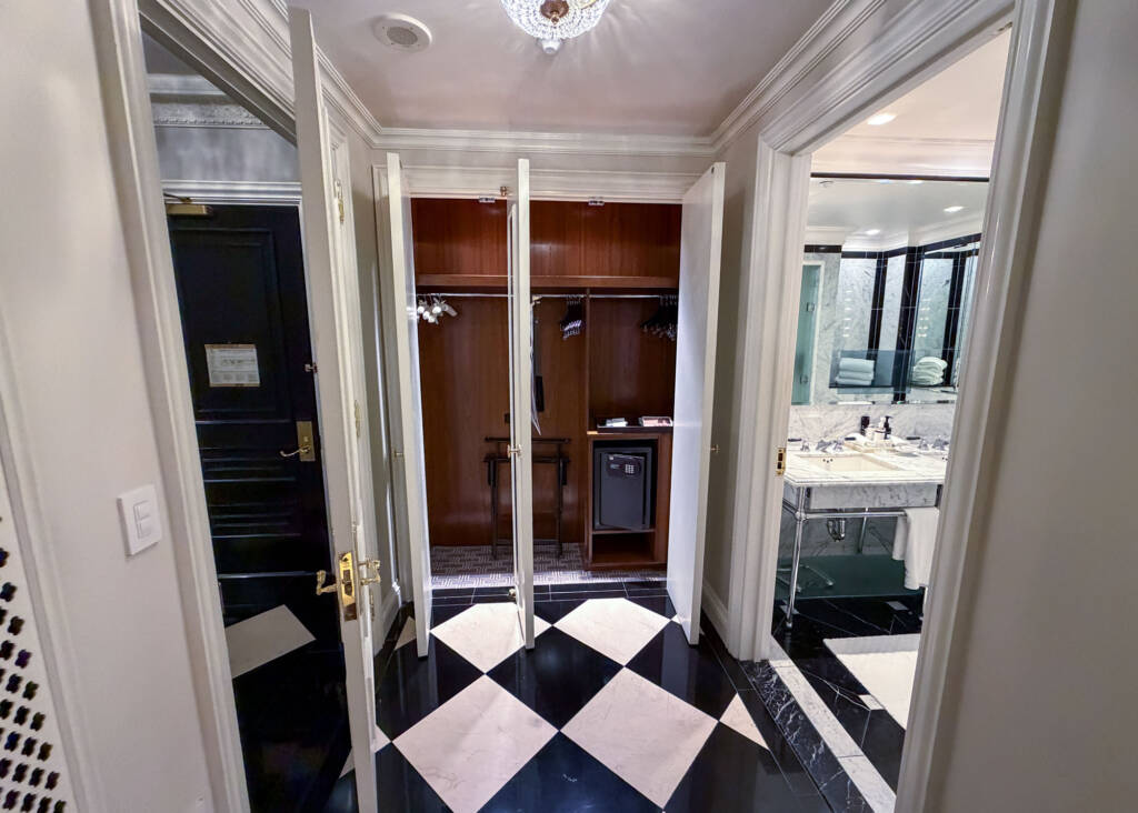 This St. Regis Suite featured a large master bedroom with a King bed, two different hallways containing multiple storage closets, and a separate living room with a spacious sitting area.
