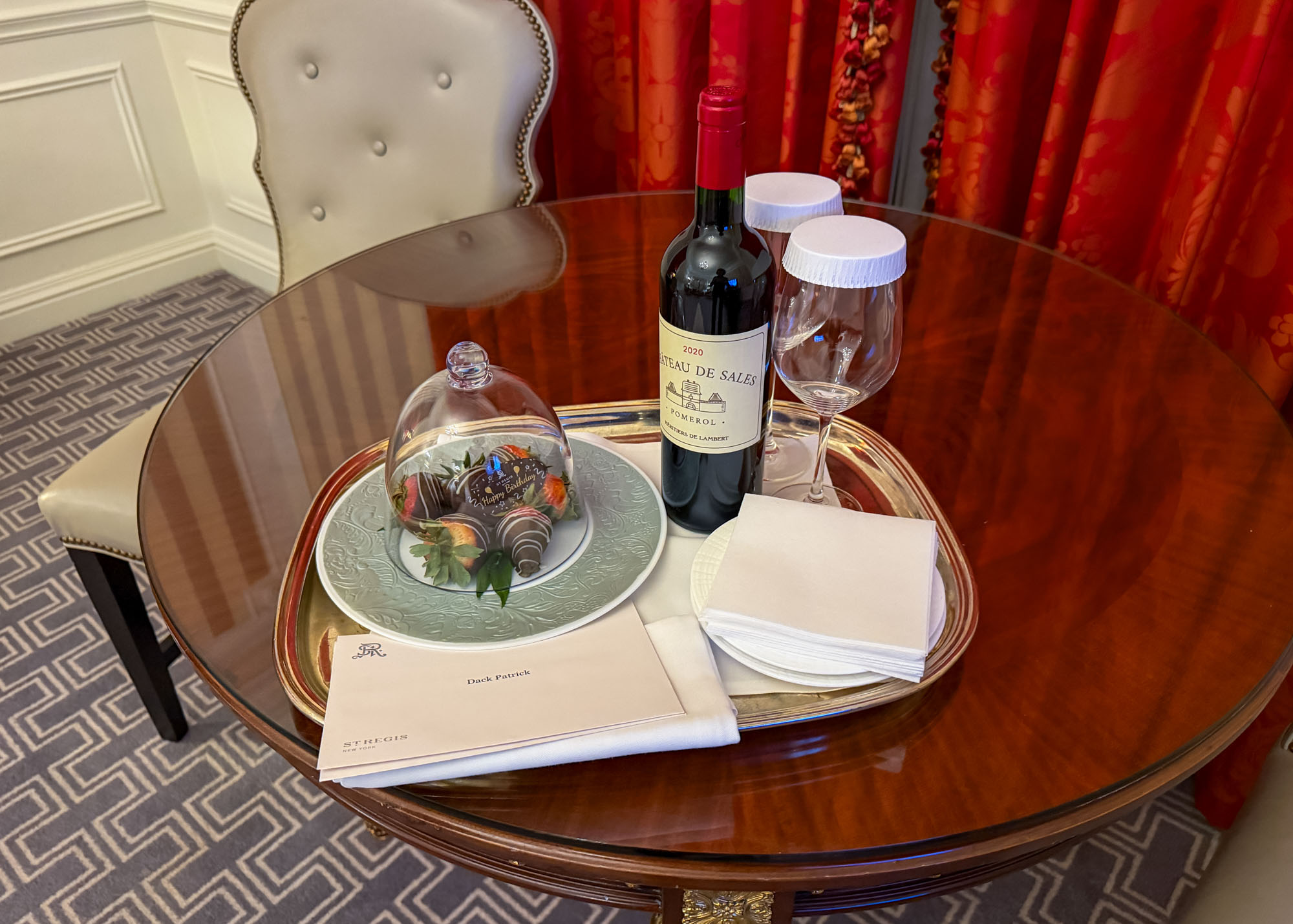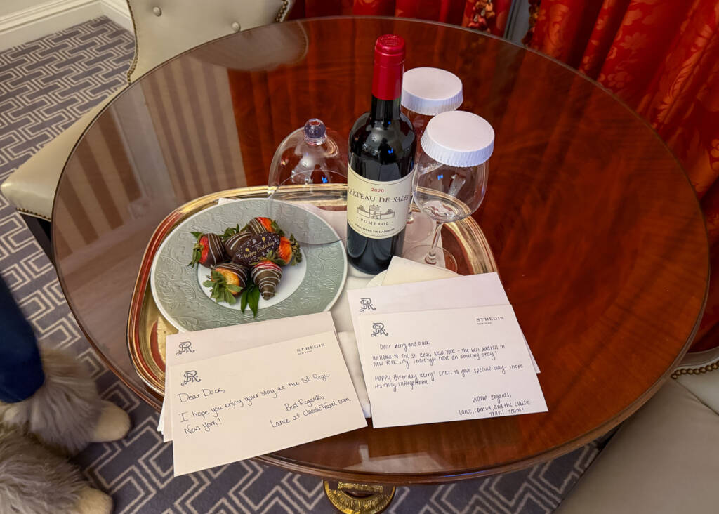 Welcome Amenity: A personalized touch waiting for us upon arrival including two notes from our travel advisors at Classic Travel (thanks Camila & Lance!), a bottle of beautiful Pomerol from France, and chocolate covered strawberries.