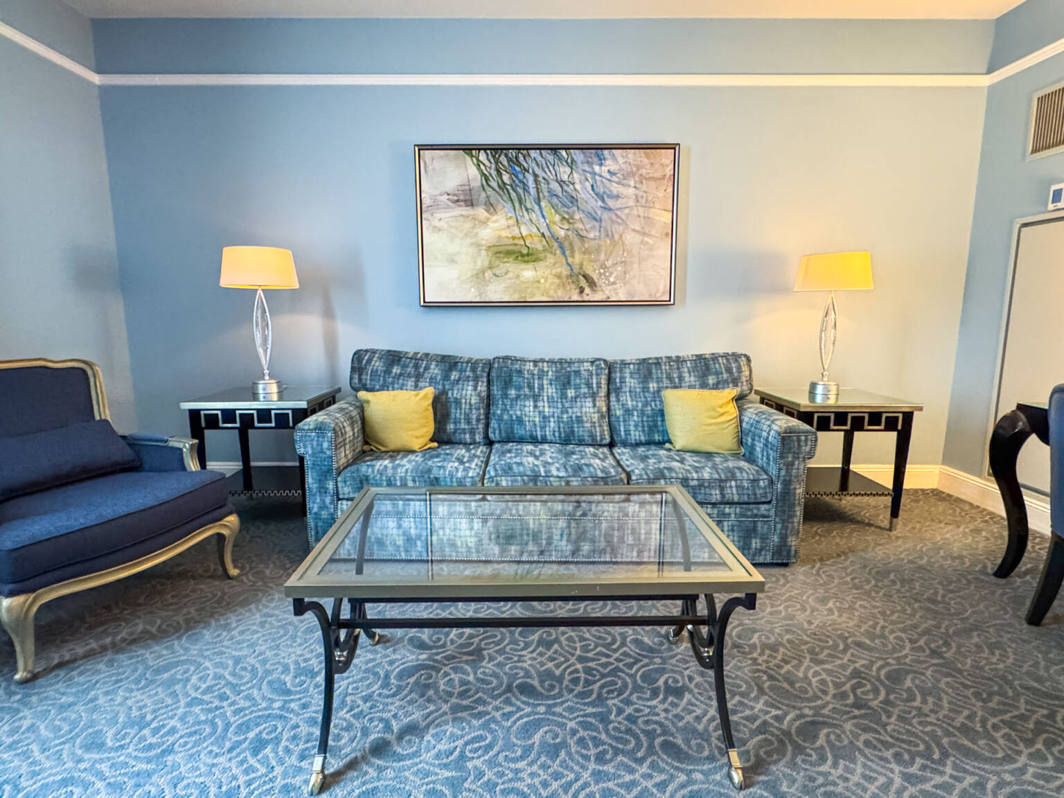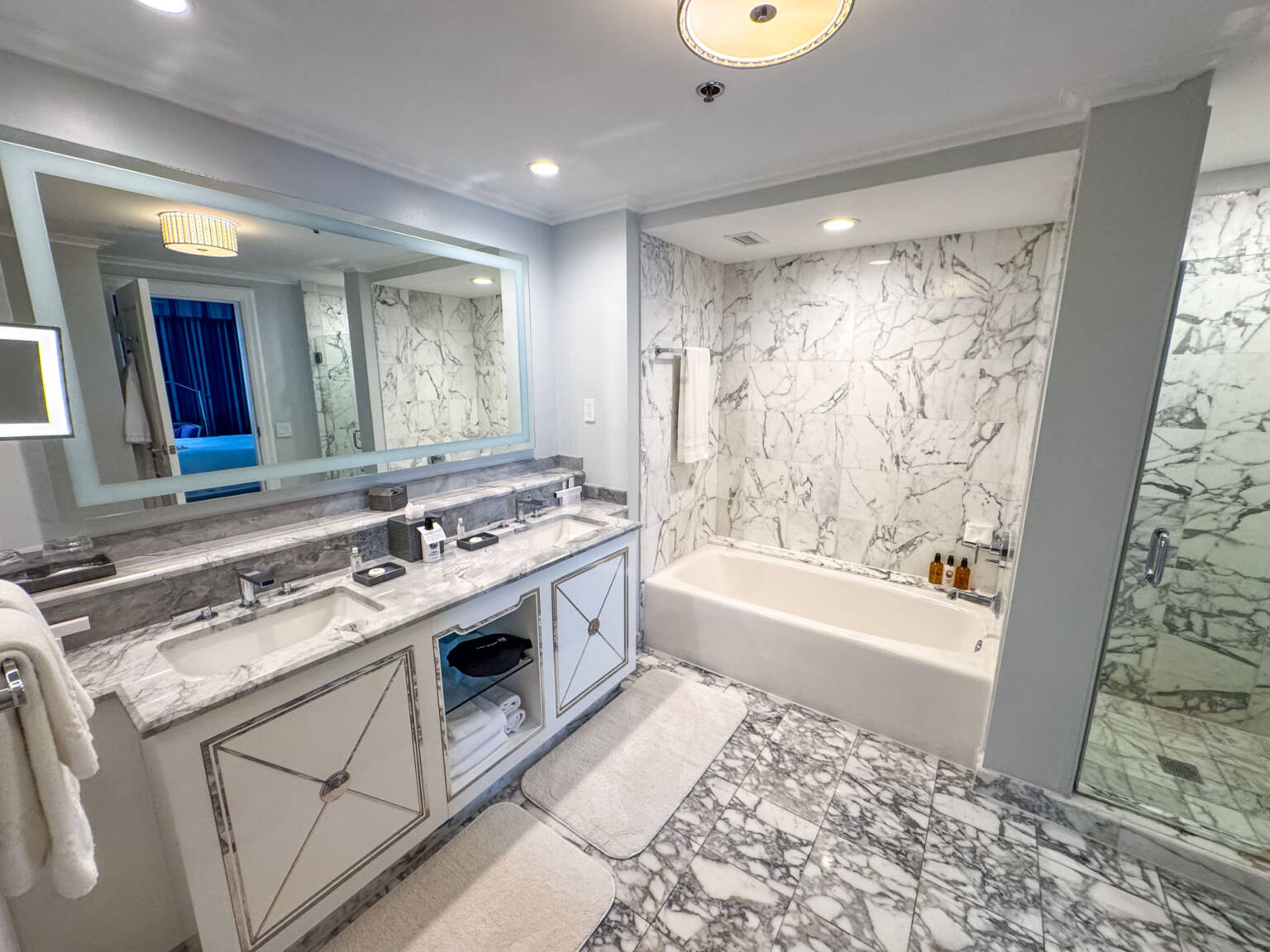 We got super lucky and were upgraded to a gorgeous Executive Suite—what a wonderful surprise! The suite was fantastic, featuring a separate living room, a proper bedroom, and a spacious full bathroom. Just like you’d expect in a suite, it included two bathrooms: one being a half-bath and the other a full bath. We really enjoyed the lovely views looking out at the city and the hotel’s terrace area.