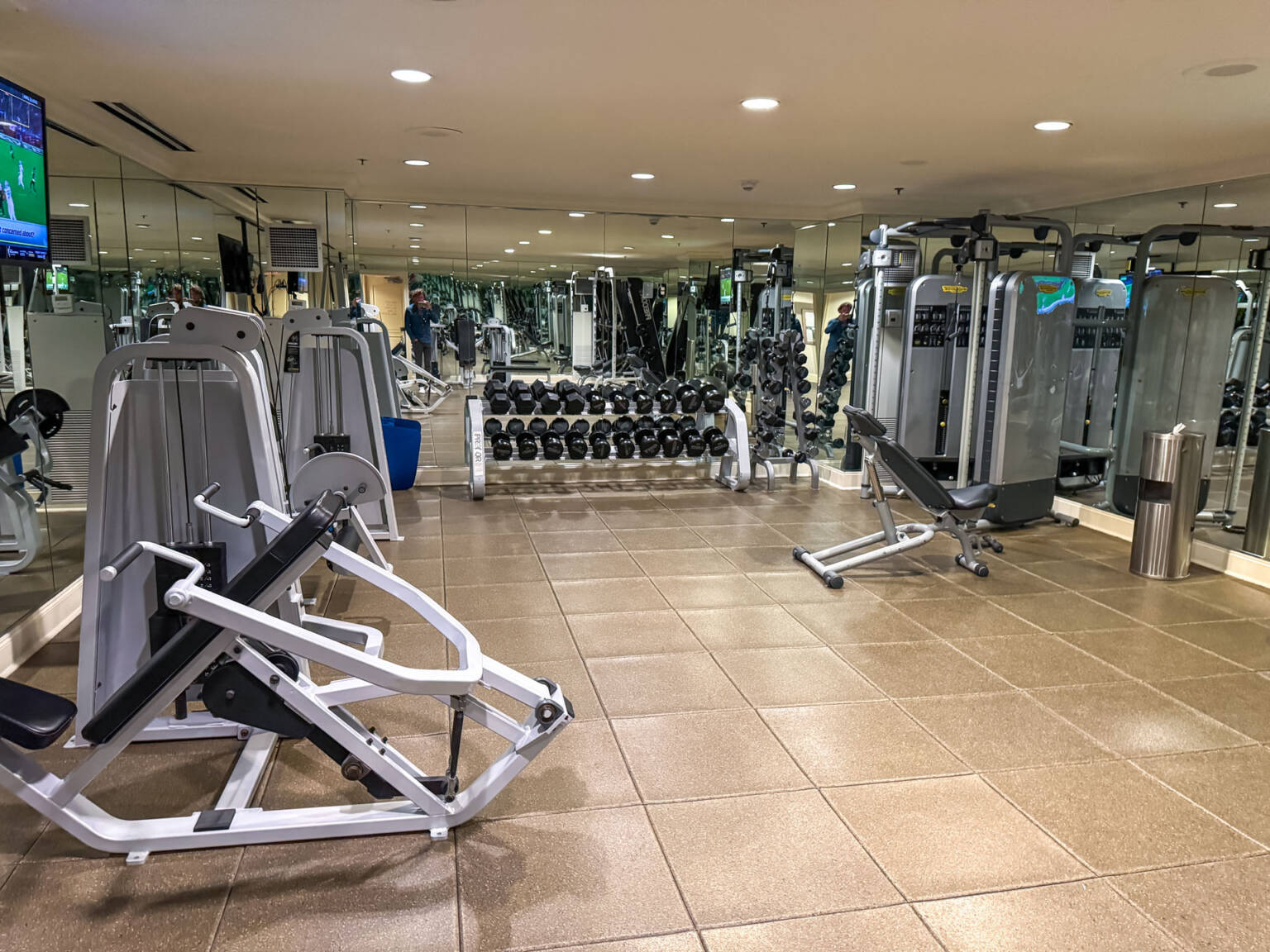 When you first walk in, you’re on the ground floor. That’s where you’ll find the valet drop-off and the street entrance, naturally. The entrance to the huge 25,000 square foot Spa is right down here, making it super easy to pop in for a treatment or hit the gym. Speaking of which, the gym is impressively large—seriously, they have virtually every piece of workout equipment you could possibly need. Oh, and there’s a cute little shop down here for candles, clothes, and, of course, all that Ritz-Carlton branded gear.