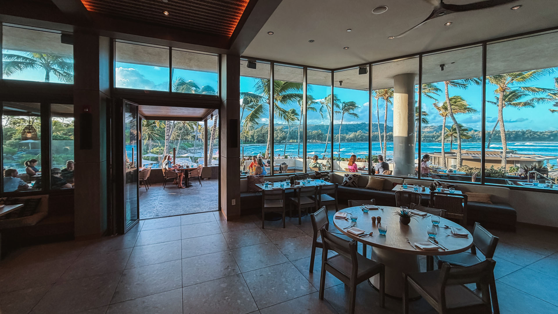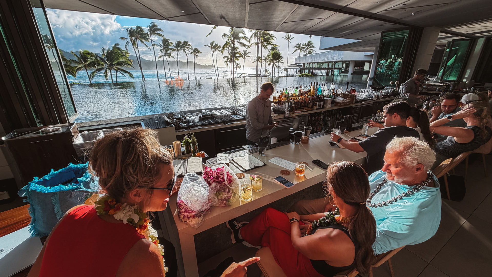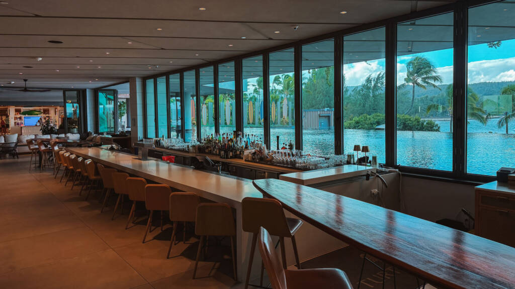 The spectacular lobby bar truly stands as the heart of the resort. It provides stunning, panoramic views overlooking meticulously designed tiered fountains, the tranquil bay, and the massive ocean waves beyond. What elevates the evening ambiance are the unique gas fire pits strategically placed inside the fountains. This clever design element creates a breathtaking contrast of fire and water, giving the entire open-air area a warm, inviting glow that encourages guests to linger over cocktails late into the evening. It’s a beautifully executed space that merges modern resort design with the natural elements of the North Shore. There are plenty of lovely sitting areas for afternoon and evening cocktails, with attentive waitstaff circulating constantly.