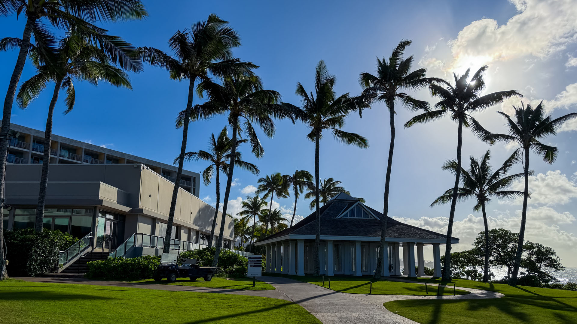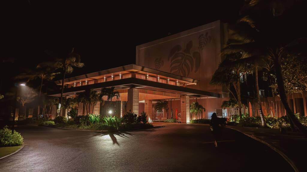 Beyond the water amenities, we highly recommend taking the time to explore the entire meticulously maintained property on foot. The landscape architecture is stunning, particularly when walking around the front grassy areas often utilized for elegant wedding ceremonies. These grounds are exceptionally beautiful and highly picturesque, especially in the evening when the resort lighting enhances the tropical foliage. For the photography enthusiast, the long route back to your suite after a late afternoon at the beach provides the perfect opportunity to capture the breathtaking Hawaiian sunset over the palm trees and pools. This is the ideal time to snap photos as the golden hour light creates perfect shadows and colors. Furthermore, the experience of hanging out at the pool bar is unique; during our visit, we enjoyed watching the World Series on the television screens with the dramatic backdrop of the ocean crashing just behind the bar—a truly memorable blending of relaxation and entertainment.