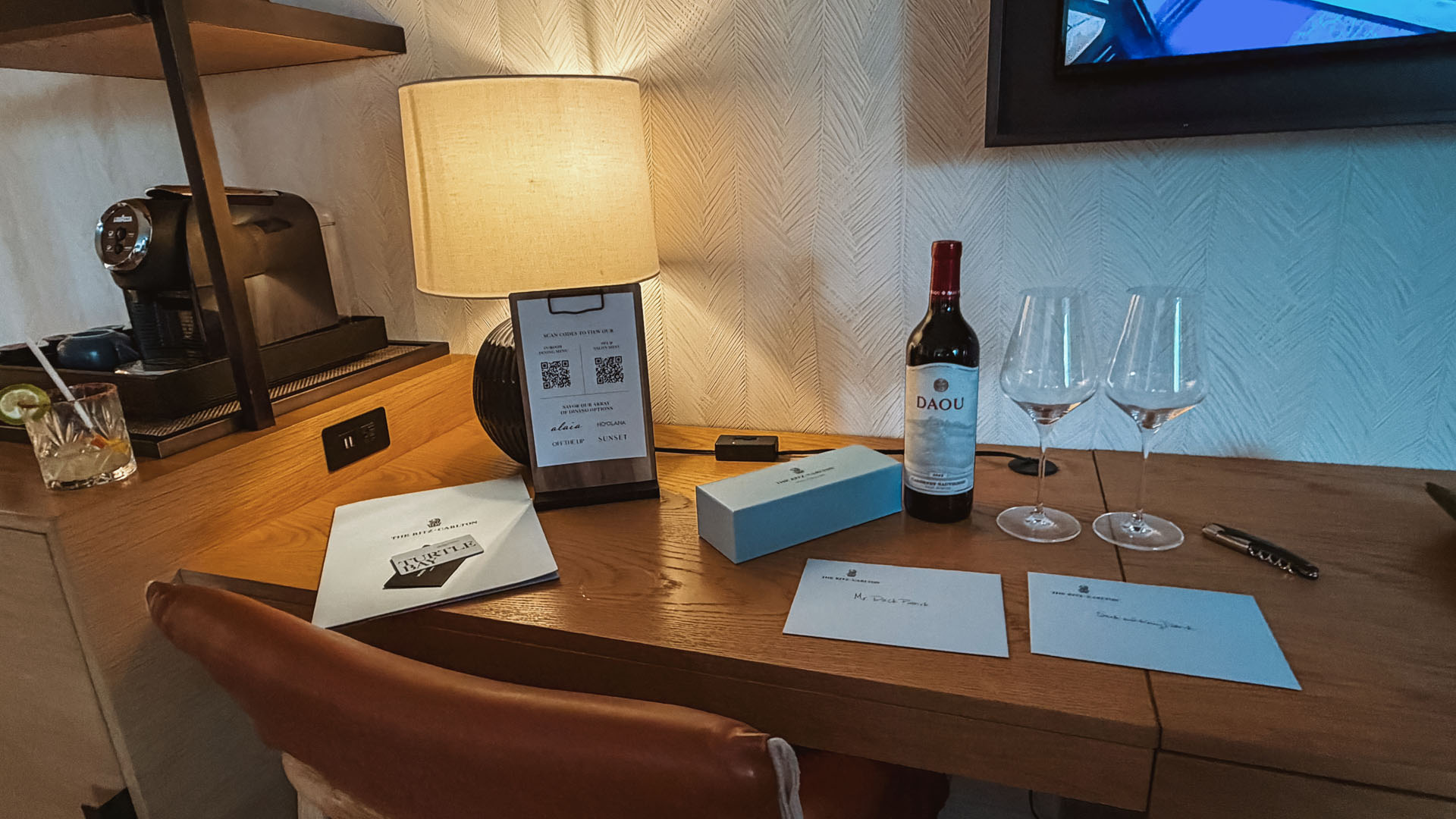 However, the team did excel in other traditional luxury services. The air conditioning was powerful and efficient, crucial for the humid climate. The empty large fridge was appreciated, and the balcony was perfect for morning coffee. Though the bed and sheets did not feel like the traditional Ritz-Carlton mattress, they were well-suited for the hot and humid climate. We received nightly turndown service while we were out, complete with the expected, high-quality Ritz-Carlton chocolates. Furthermore, we were thrilled to find a massive thank you note and a beautiful bottle of wine awaiting us upon arrival, courtesy of Classic Travel, a touch that underscored the personalized service.