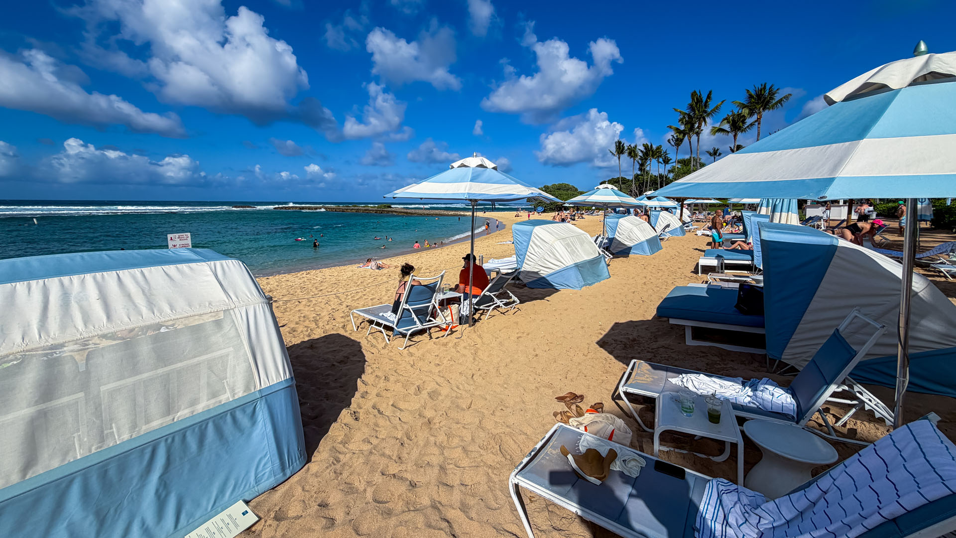 The resort boasts a massive main pool and a very large outdoor Jacuzzi that attracts many guests. However, we preferred the tranquility of the direct beach access. The property provides complimentary chairs and beach towels at a dedicated stand, making a day by the ocean effortless. Importantly, the beach area benefits greatly from its location within a bay protected by large jetties. This natural and man-made barrier ensures the water is traditionally quite calm, providing a gentle environment ideal for wading, paddleboarding, or simply relaxing on the sand, a stark contrast to the rougher waters found on other parts of the North Shore.