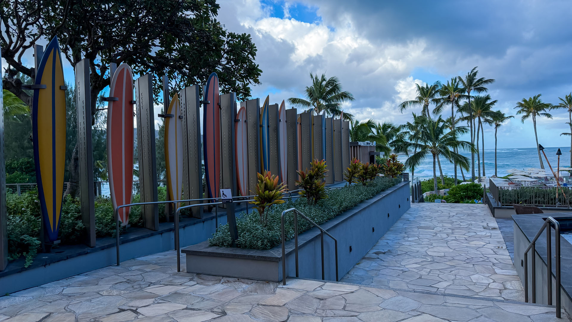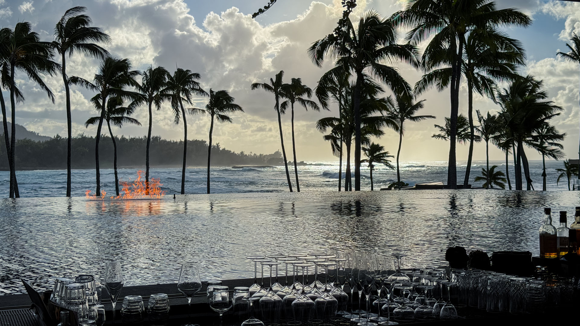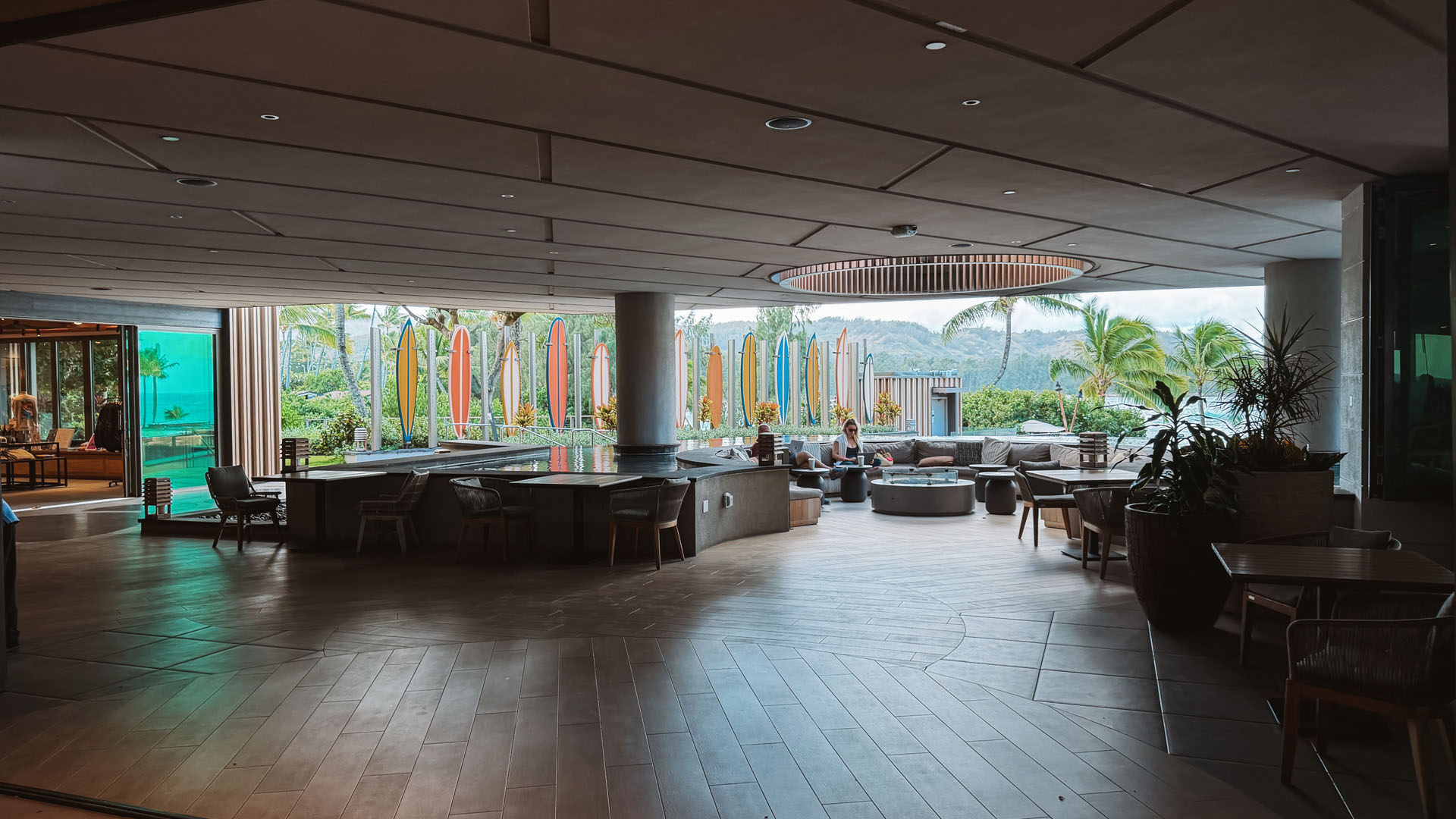 The spectacular lobby bar truly stands as the heart of the resort. It provides stunning, panoramic views overlooking meticulously designed tiered fountains, the tranquil bay, and the massive ocean waves beyond. What elevates the evening ambiance are the unique gas fire pits strategically placed inside the fountains. This clever design element creates a breathtaking contrast of fire and water, giving the entire open-air area a warm, inviting glow that encourages guests to linger over cocktails late into the evening. It’s a beautifully executed space that merges modern resort design with the natural elements of the North Shore. There are plenty of lovely sitting areas for afternoon and evening cocktails, with attentive waitstaff circulating constantly.