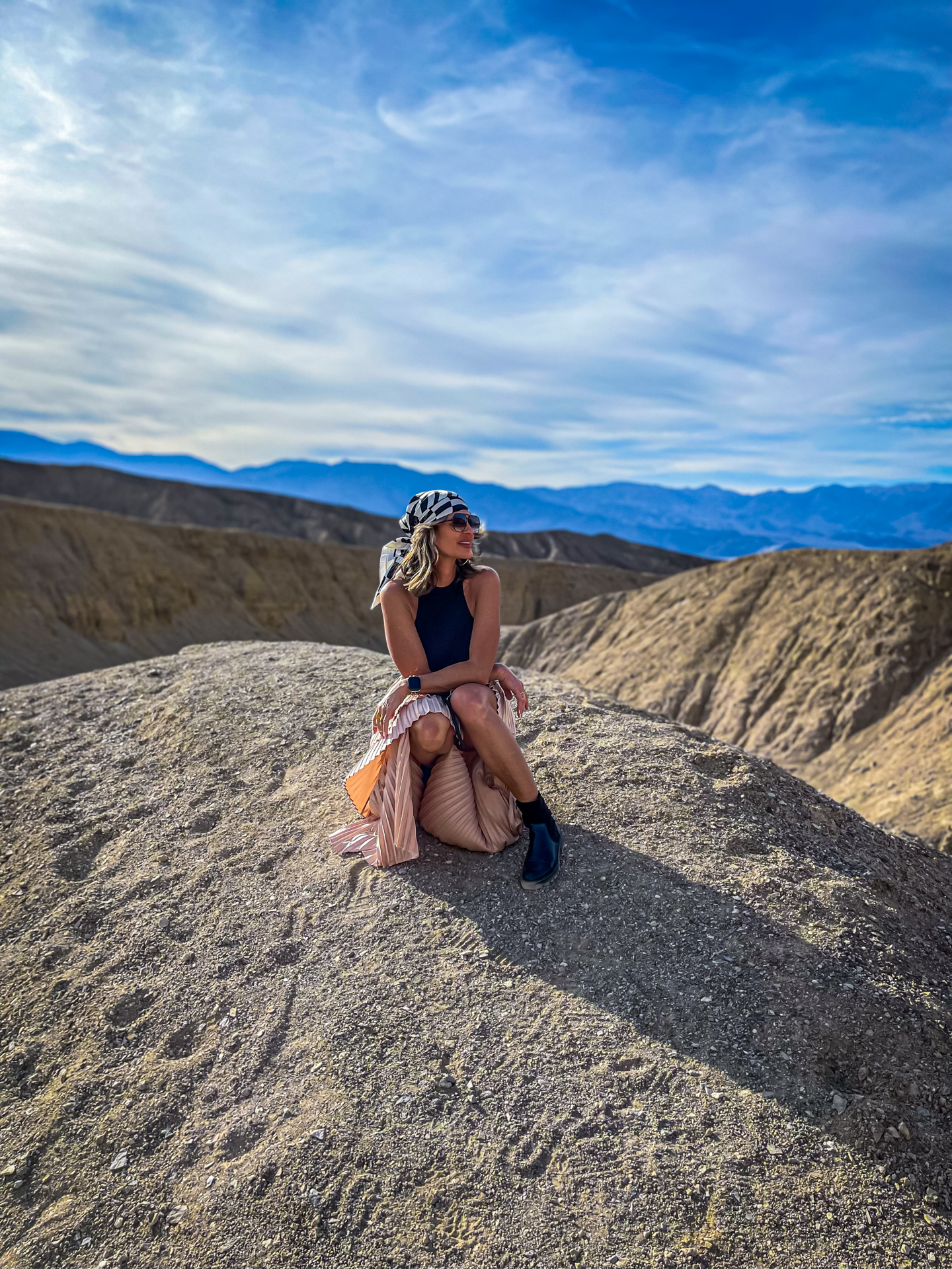 The Exit View (Mandatory!): After capturing the colored hills, make sure to turn around! The overlook from this spot back into Death Valley and the setting sun over the parking lot is absolutely stunning.