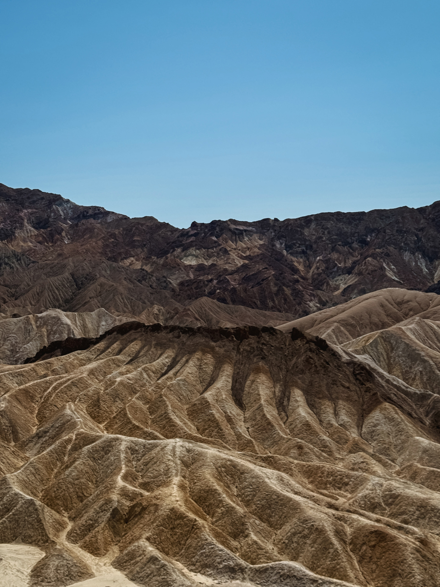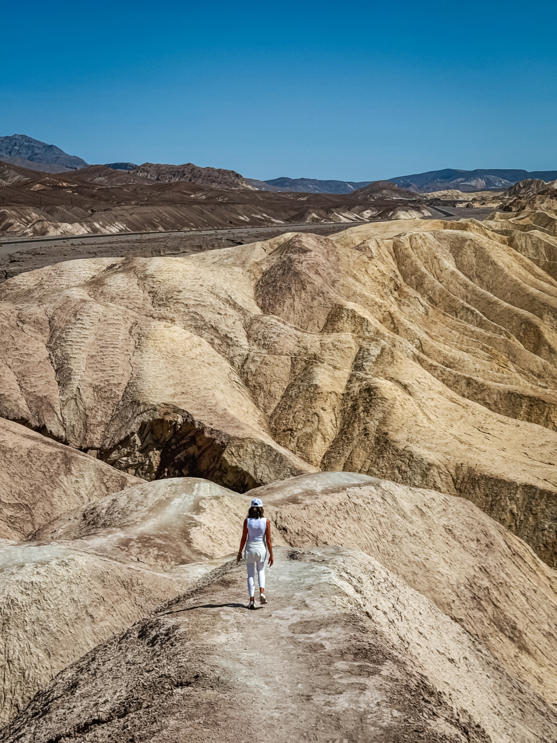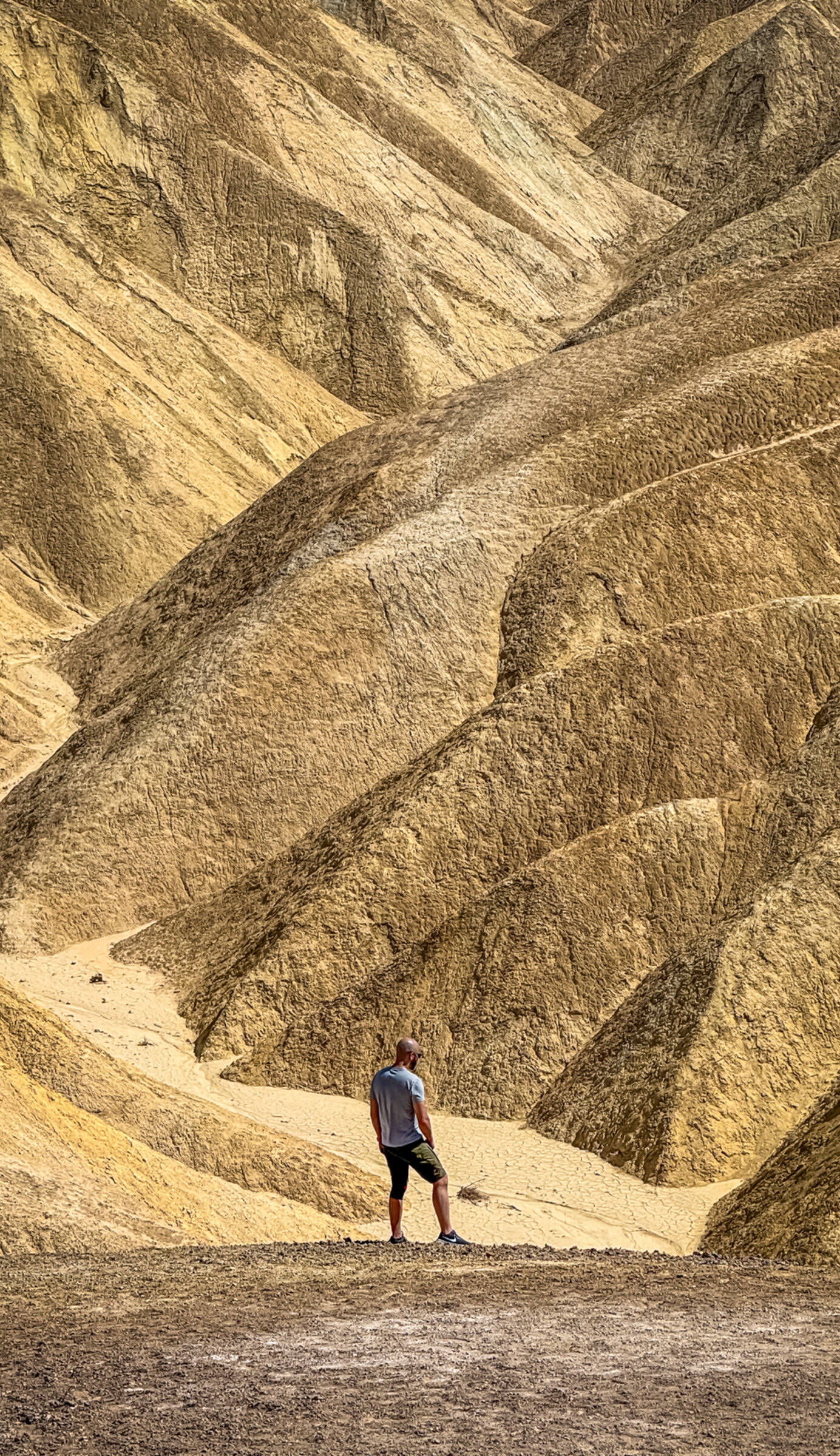 These yellow and brown striped hills have been shaped by the powerful force of water over millions of years. Even during dry times, the path carved by water erosion is unmistakable. Gazing beyond the badlands, views of the salt flats covering the floor of Death Valley are visible in the distance, with the hulk of the Panamint Mountains towering above.
