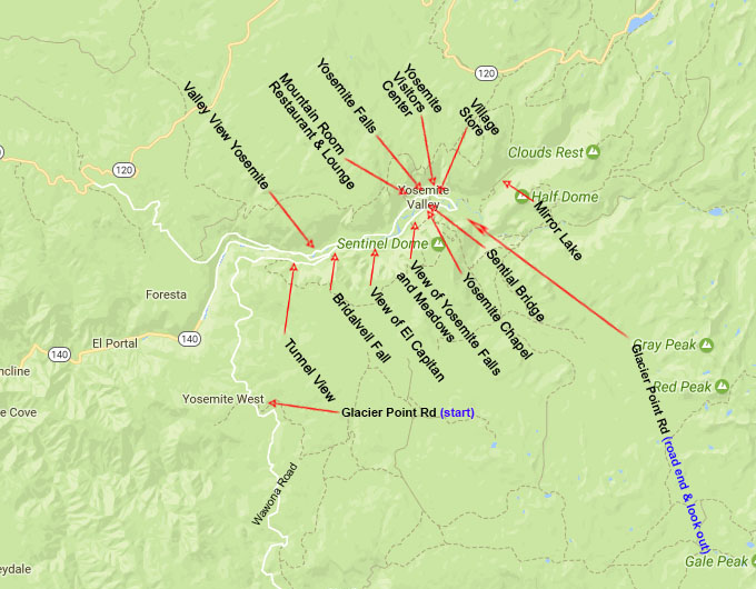 To access Glacier Point and hike down to Yosemite Valley, its best to Yosemite Valley and buy a shuttle ticket to the top of Glacier Point. The hike down takes roughly 8+ hours with all the stops.